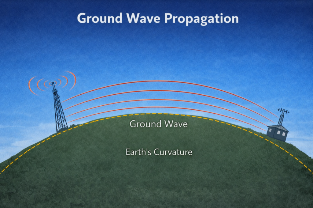 The answer lies at the boundary of our planet and its atmosphere. The Earth is not a perfect conductor, and the air above it is not a perfect insulator. The interface between the two is a lossy, imperfect medium that responds to changing electric fields. When WWVB’s antenna’s field oscillates, it does not remain perfectly confined. A small fraction of the energy couples into the surface of the Earth and propagates outward as a ground wave.